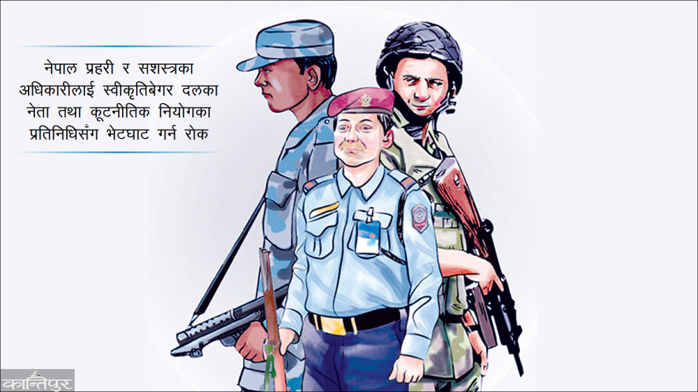 गृह मन्त्रालयले नेपाल प्रहरी र सशस्त्र प्रहरीका उच्च अधिकारीलाई विभागीय स्वीकृतिबेगर राजनीतिक दलका नेता तथा कूटनीतिक नियोगका प्रतिनिधिसँग भेटघाट गर्न रोक लगाएको छ । उपप्रधान तथा गृहमन्त्री रवि लामिछानेको निर्देशनमा गृह मन्त्रालयले दुवै सुरक्षा निकायका अधिकारीलाई राजनीतिक र कूटनीतिक भेटघाटमा कडाइ गरेको हो । राजनीतिक र कूटनीतिक भेटका लागि महानिरीक्षकका हकमा मन्त्रालय र अरू अधिकारीका हकमा संगठन प्रमुखबाट अनिवार्य स्वीकृति लिनुपर्ने व्यवस्था गरिएको छ । अनुमतिबेगर भेटघाट भएको पाइए अनुशासनको कारबाही गरिने मन्त्रालयले जनाएको छ ।