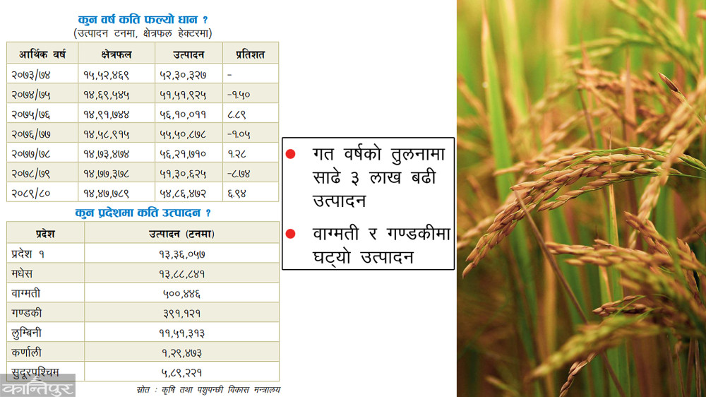 गत वर्ष असोज ३० देखि कात्तिक २ सम्मको बेमौसमी वर्षाले विशेष गरी लुम्बिनी र सुदूरपश्चिमका १ लाखभन्दा बढी हेक्टरमा लगाइएको धान बालीमा क्षति पुर्याउँदा उत्पादन घटेको थियो । ०७८/७९ मा ५१ लाख ३० हजार ६ सय २५ टन मात्रै उत्पादन भएको थियो ।