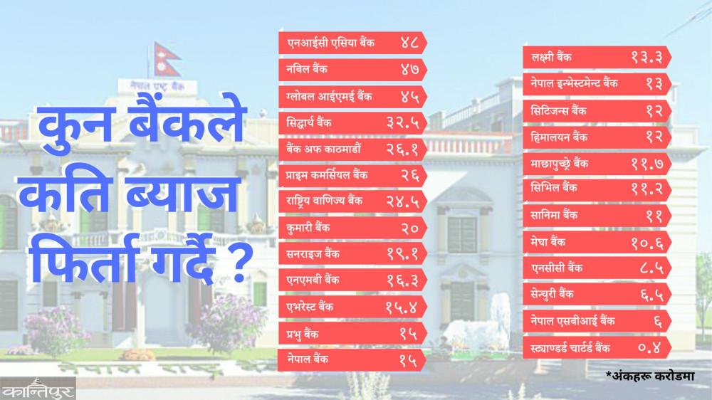 सबैभन्दा कम ब्याज फिर्ता गर्नुपर्ने बैंक भने स्टयान्डर्ड चार्टड बैंक रहेको छ । उसले जम्मा ४० लाख रुपैयाँ मात्र फिर्ता गर्नुपर्नेछ ।