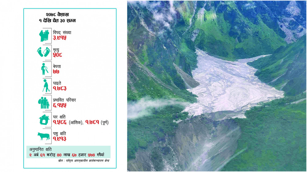 गृह मन्त्रालयको राष्ट्रिय आपत्कालीन कार्यसञ्चालन केन्द्रका अनुसार मंगलबारसम्म विपद्का २ सय १४ वटा घटना भइसकेका छन् । त्यसमा बाढीको १, पहिरोका ४, भारी वर्षाका ३, चट्याङका २४, आगलागीका १२४, वन डढेलोका ४, वन्यजन्तुसम्बन्धी १५, हावाहुरीका ३६ र सर्पदंशका २ वटा छन् । विपद्मा परेर २५ दिनमा ३१ जनाको ज्यान गएको छ भने ५७ जना घाइते भएका छन् । अहिलेसम्म २५९ परिवार प्रभावित भएका छन् भने आंशिक ७९ र पूर्ण रूपमा ३८ घरमा क्षति पुगेको छ । सबै खाले विपद्बाट १६ करोड ८५ लाख ४४ हजार ९ सय ६० रुपैयाँबराबरको क्षति भएको छ ।