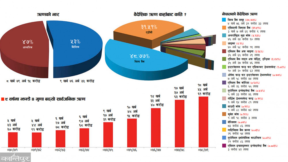 नेपालले तिर्नुपर्ने विदेशी ऋणमध्ये बहुपक्षीय ऋण ८ खर्ब ५४ अर्ब र द्विपक्षीय ऋण १ खर्ब २१ अर्ब ८७ करोड रुपैयाँ बराबर छ । सबैभन्दा धेरै विश्व बैंकअन्तर्गतको इन्टरनेसनल डेभलपमेन्ट एसोसिएसनलाई ४ खर्ब ७६ अर्ब ३१ करोड रुपैयाँ तिर्न बाँकी छ । दोस्रो ठूलो ऋणदाता एसियाली विकास बैंक (एडीबी) हो जसलाई ३ खर्ब ७ अर्ब ६९ करोड रुपैयाँ तिर्न बाँकी छ । त्यस्तै अन्तर्राष्ट्रिय मुद्रा कोषलाई नेपालले ४५ अर्ब तिर्नु छ ।