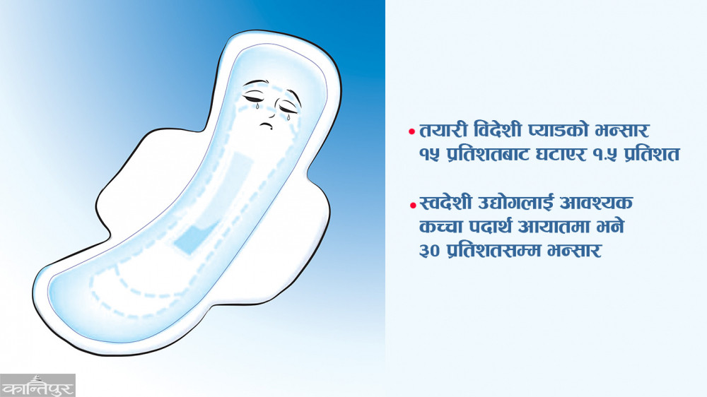 काठमाडौँ — महिनावारी हुँदा महिलाले प्रयोग गर्ने सेनिटरी प्याडमा सरकारले भन्सार छुट दिएपछि राज्य, स्वदेशी उद्योग र उपभोक्ता उल्टो मर्कामा परेका छन् । विदेशबाट तयारी अवस्थामा आउने प्याडको भन्सारमा ९० प्रतिशत सहुलियत दिँदा राजस्व स्वतः कम हुने भएको छ भने अर्कोतिर कच्चा पदार्थमा भन्सार यथावत् राखिएकाले स्वदेशी उद्योगको लगानी जोखिममा परेको छ ।