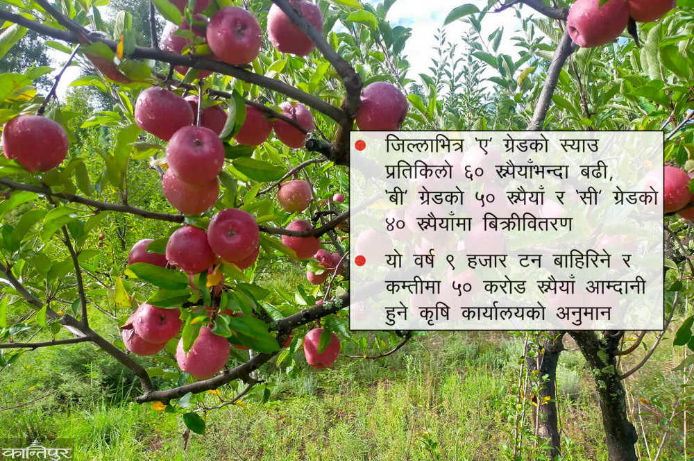 समग्रमा जिल्लामा ए ग्रेडको प्रतिकिलो ६० रुपैयाँभन्दा बढी, बी ग्रेडको ५० रुपैयाँ र ग्रेड सीको ४० रुपैयाँमा बिक्री भइरहेको कार्यालयले जनाएको छ । सोलुखुम्बु र जुम्लाका स्याउ बजारमा आइसकेका छन् । मुस्ताङ र मुगुको स्याउ भदौ अन्तिम सातादेखि मात्रै टिप्न सुरु हुन्छ । तर, किसान तथा व्यापारीले मूल्य नपाउने भन्दै गुलियो नपसेका स्याउ नै टिप्न थालिसकेका छन् । जुम्लामा गत वर्ष १२ हजार टन उत्पादन भएकामा ६ हजार ५ सय टन जिल्ला बाहिर गएको थियो । त्यसबापत ३४ करोड १८ लाख ८० हजार रुपैयाँ जिल्ला भित्रिएको थियो ।