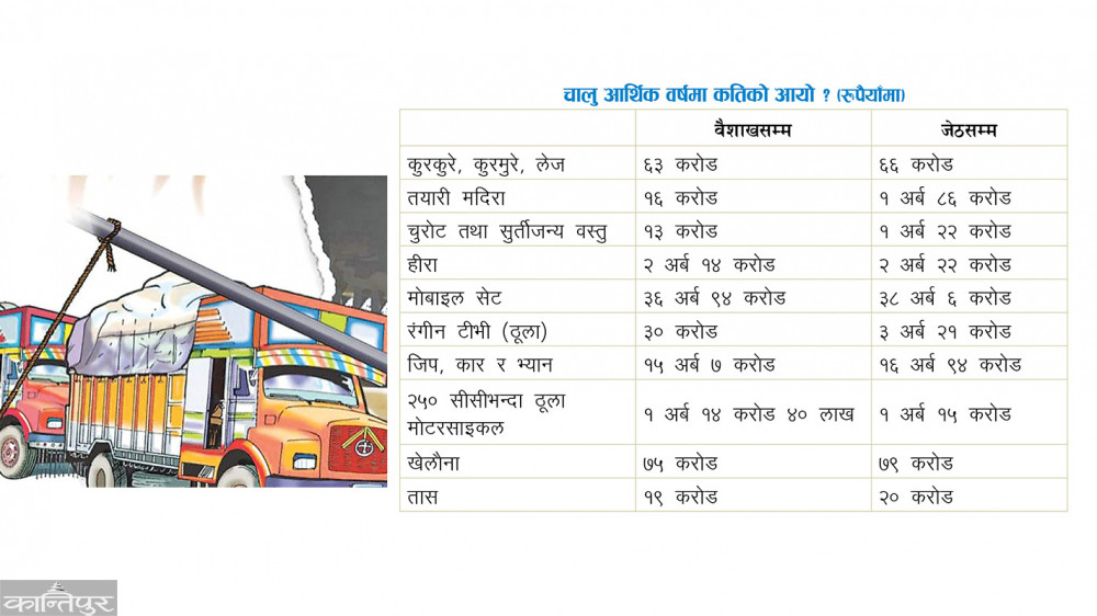 चालु आर्थिक वर्षको १० महिनामा यी वस्तुको खरिदमा ६० अर्ब २८ करोड रुपैयाँ बाहिरिएको भन्सार विभागको तथ्यांक छ । ११ महिनासम्म आइपुग्दा ६५ अर्ब १८ करोड ५८ लाख रुपैयाँ बाहिरिएको छ । खुला सीमाका कारण रक्सी, सुर्ती, चुरोट, कुरकुरे, कुरमुरेलगायतका बस्तु चोरी तस्करीबाट आइरहेको जनाइएको छ ।