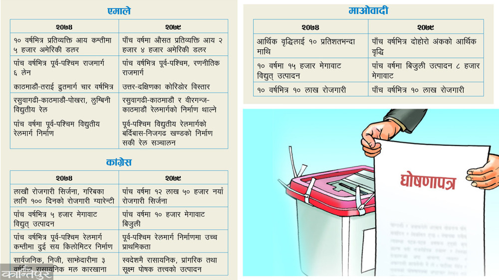 काठमाडौँ — आसन्न प्रतिनिधिसभा र प्रदेशसभा सदस्य निर्वाचनका लागि प्रमुख राजनीतिक दलहरूले घोषणापत्र सार्वजनिक गरिसकेका छन् । पटक–पटक राज्यको नेतृत्व गरिसकेका कांग्रेस, एमाले र माओवादीले अधिकांश घोषणा पुनर्मुद्रण गरेका छन् ।